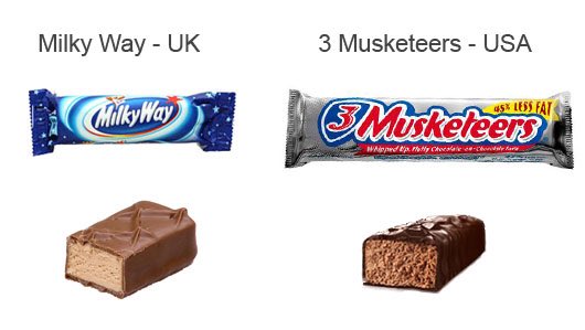 NoThe Milky Way bar was created in 1923 by Frank C. Snickers US vs UK Milky Way US vs UK a. According to Mars official website these are the main ingredients for the current Milky Way Bars. Milky Way vs 3 Musketeers. But after Googling apparently a European Milky Way is basically a 3 Musketeers. Here in the UK we only have Snickers and Mars so we dont know what Three Musketeers or Payday is. I read somewhere online that American chocolate bars go under different names than the German ones.